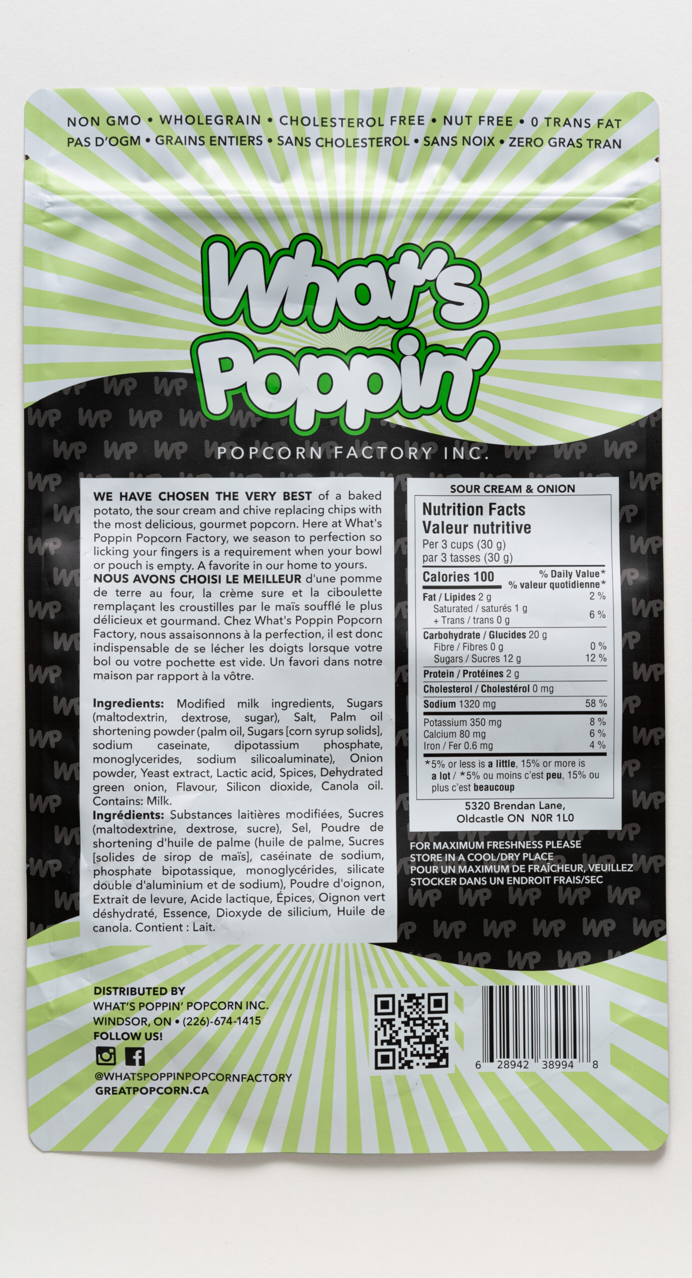 WE HAVE CHOSEN THE VERY BEST of a baked potato, the sour cream and chive replacing chips with the most delicious, gourmet popcorn. Here at What’s Poppin’ Popcorn Factory, we season to perfection so licking your fingers is a requirement when your bowl or pouch is empty. A favourite in our home to yours.